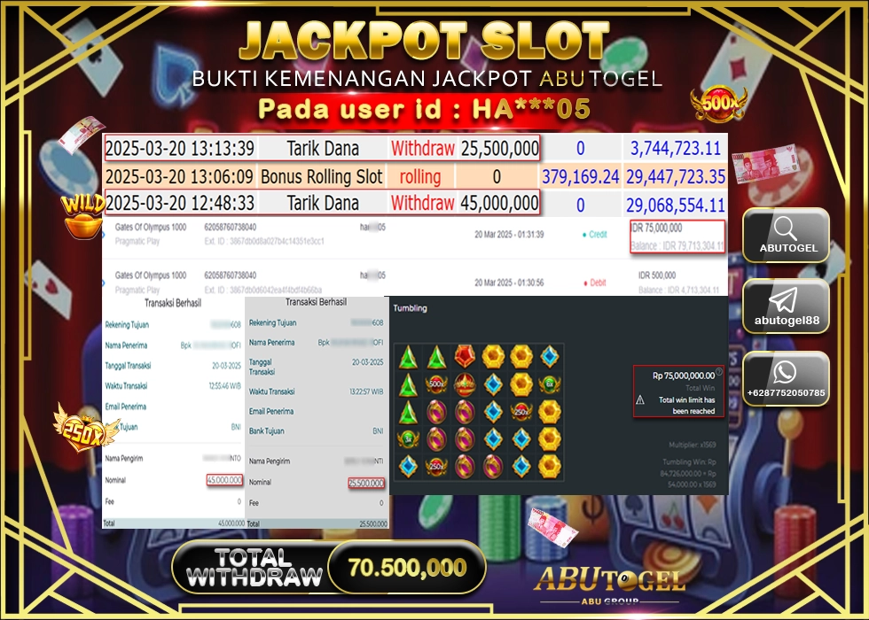 Berikut adalah Bukti Jackpot ABUTOGEL Slot Online kamis, 20 maret 2025 :