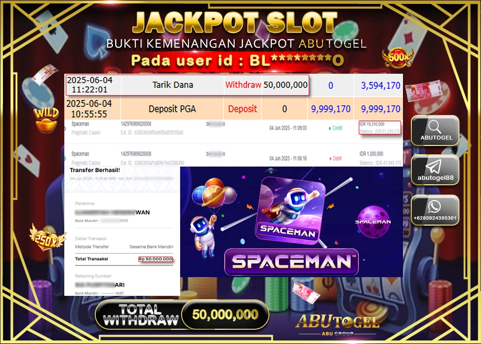 Berikut adalah Bukti Jackpot ABUTOGEL Slot Online Rabu, 04 Juni 2025 :