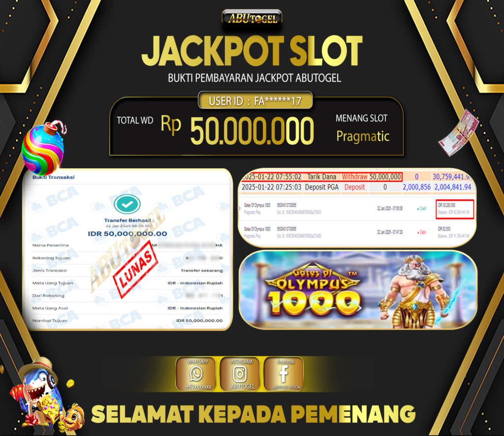 Berikut adalah Bukti Jackpot ABUTOGEL Slot Online Rabu, 22 Januari 2025 :