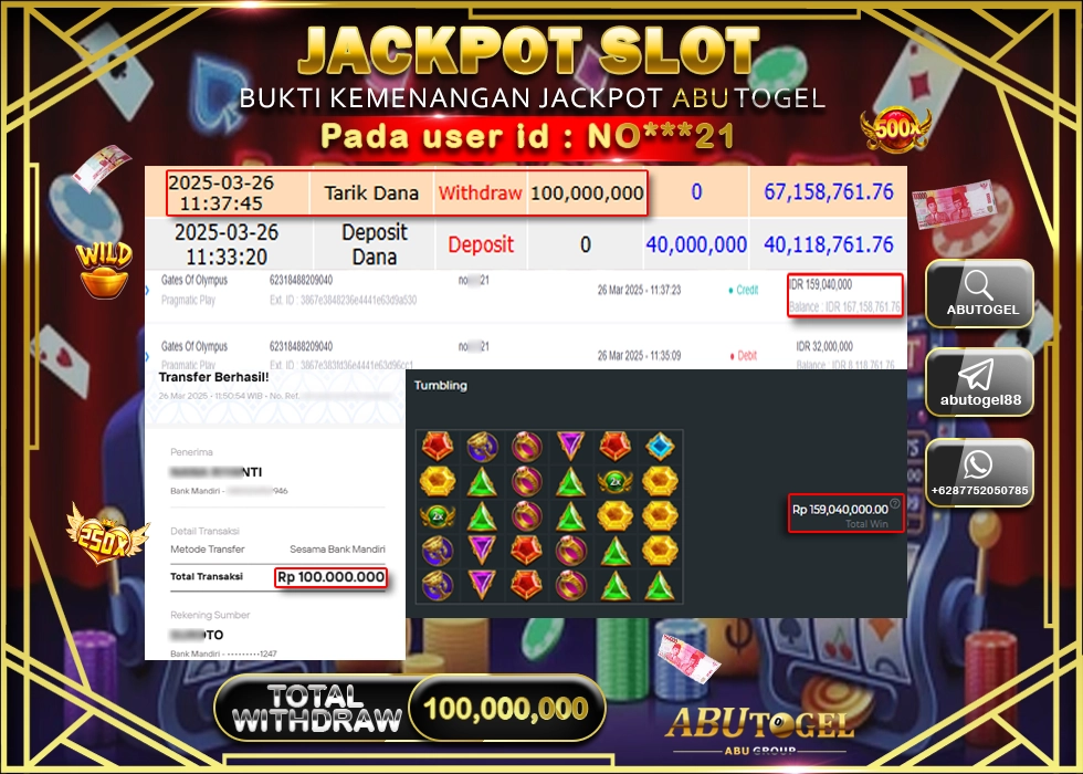 Berikut adalah Bukti Jackpot ABUTOGEL Slot Online Rabu, 26 maret 2025 :