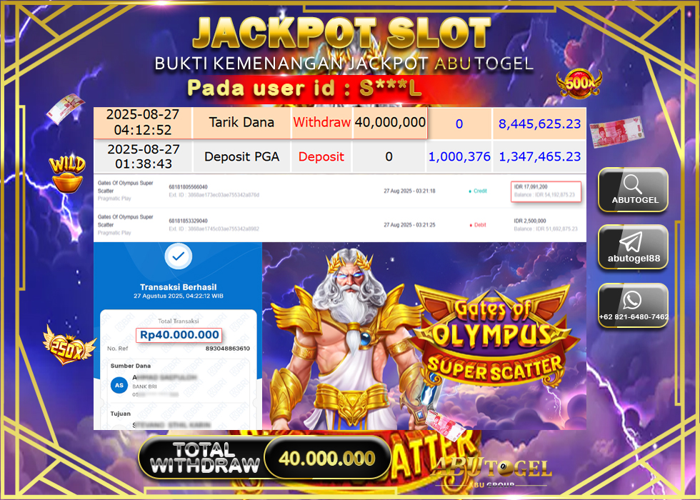 Berikut adalah Bukti Jackpot ABUTOGEL Slot Online Rabu, 27 Agustus 2025 :