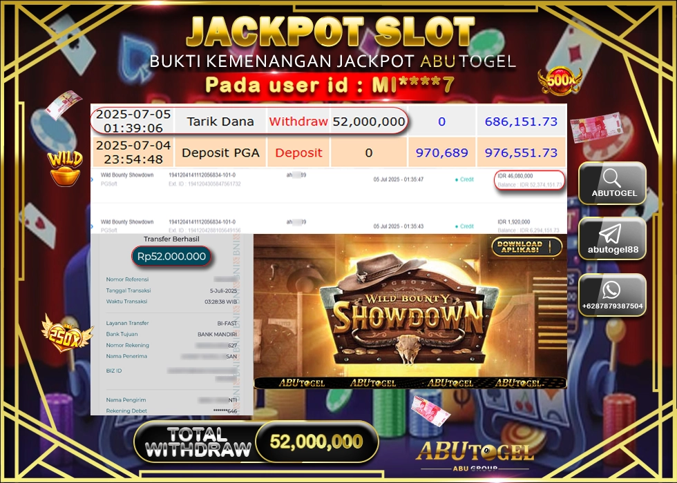 Berikut adalah Bukti Jackpot ABUTOGEL Slot Online Sabtu, 05 Juli 2025 :