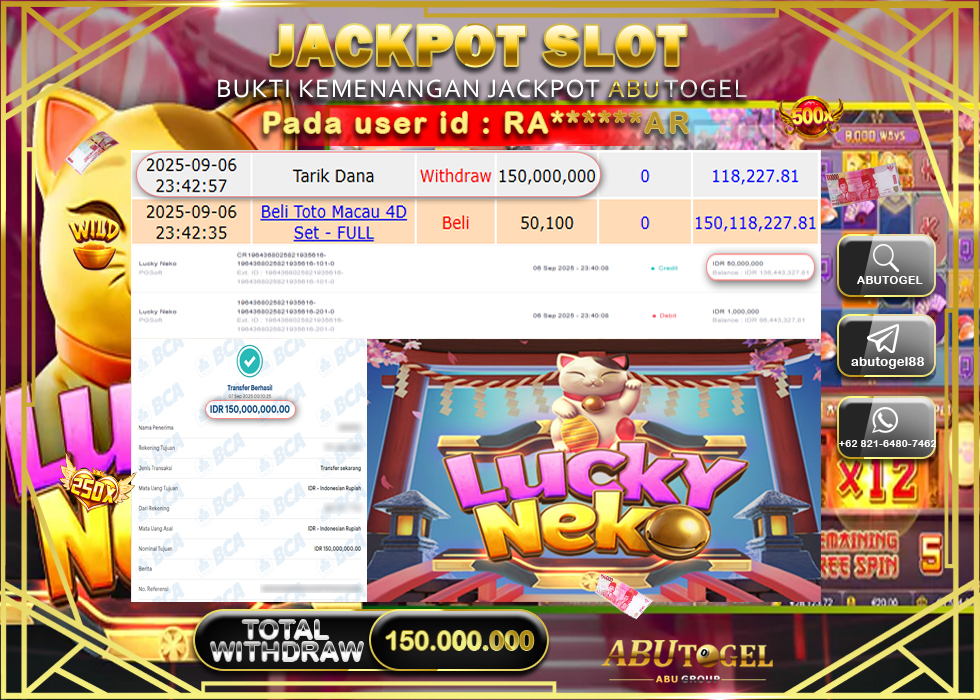 Berikut adalah Bukti Jackpot ABUTOGEL Slot Online Sabtu 06 September 2025 :
