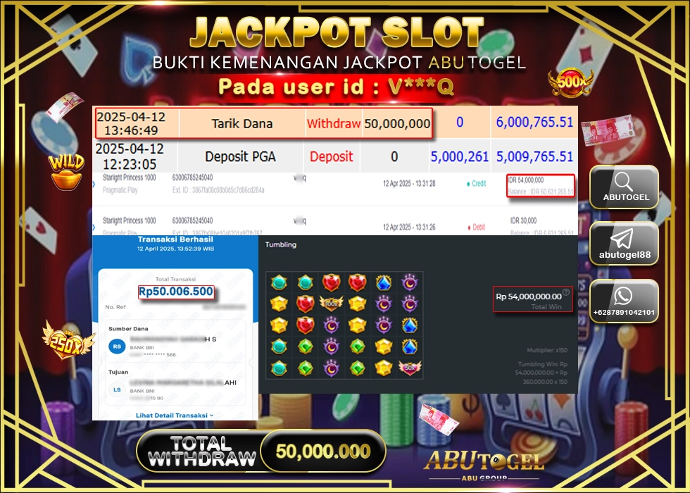 Berikut adalah Bukti Jackpot ABUTOGEL Slot Online Sabtu, 12 April 2025 :