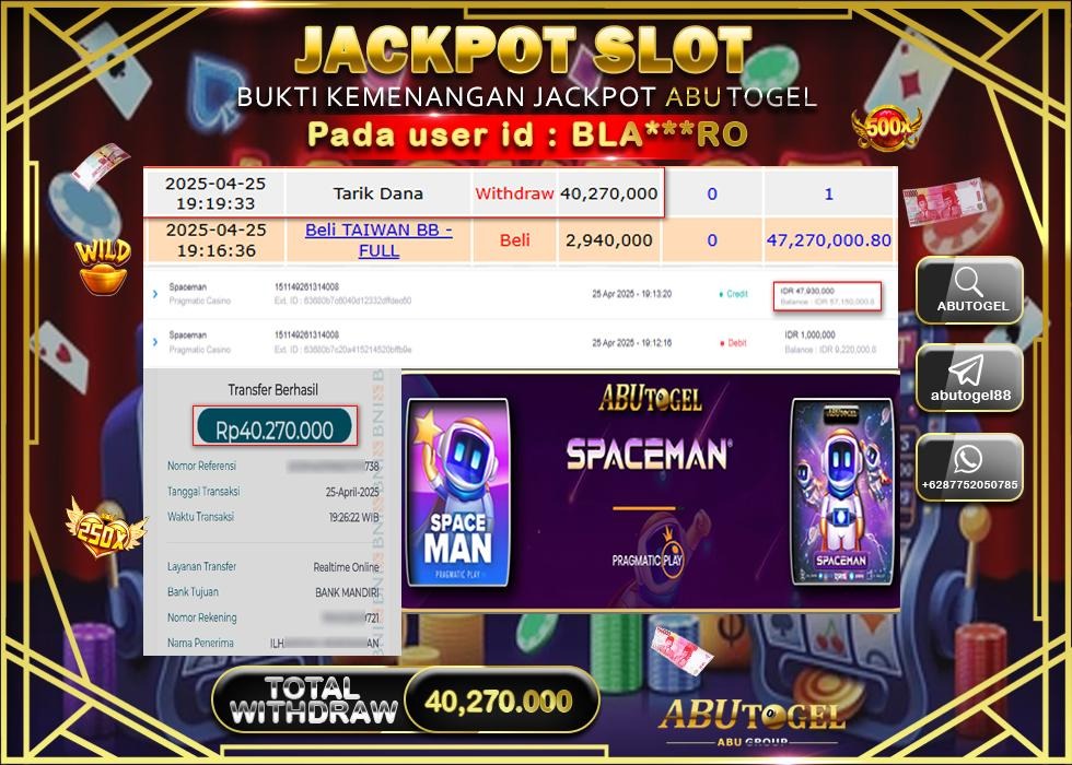 Berikut adalah Bukti Jackpot ABUTOGEL Slot Online Sabtu, 26 April 2025 :