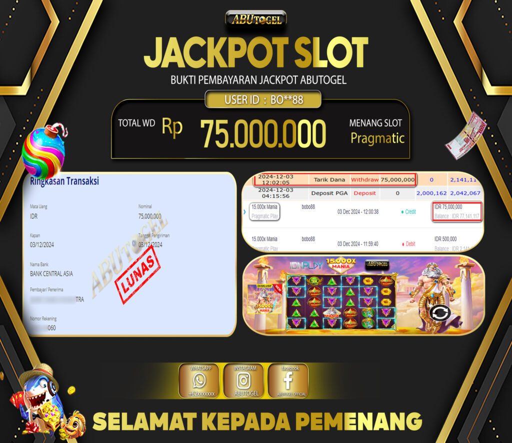 Berikut adalah Bukti Jackpot ABUTOGEL Slot Online Selasa, 03 Desember 2024 :