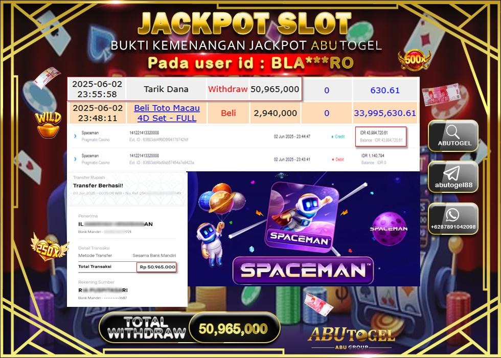 Berikut adalah Bukti Jackpot ABUTOGEL Slot Online Selasa, 03 Juni 2025 :