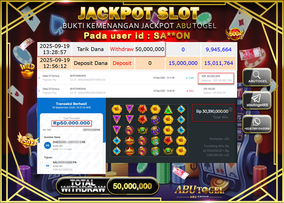 Berikut adalah Bukti Jackpot ABUTOGEL Slot Online Jumat 19 September 2025 :