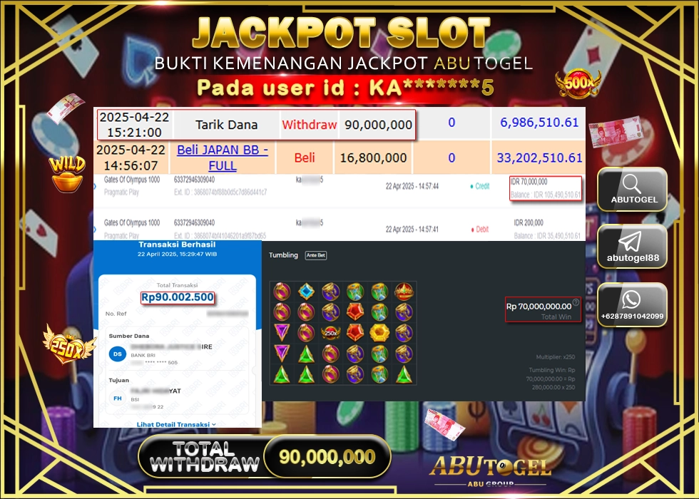 Berikut adalah Bukti Jackpot ABUTOGEL Slot Online Selasa, 22 April 2025 :