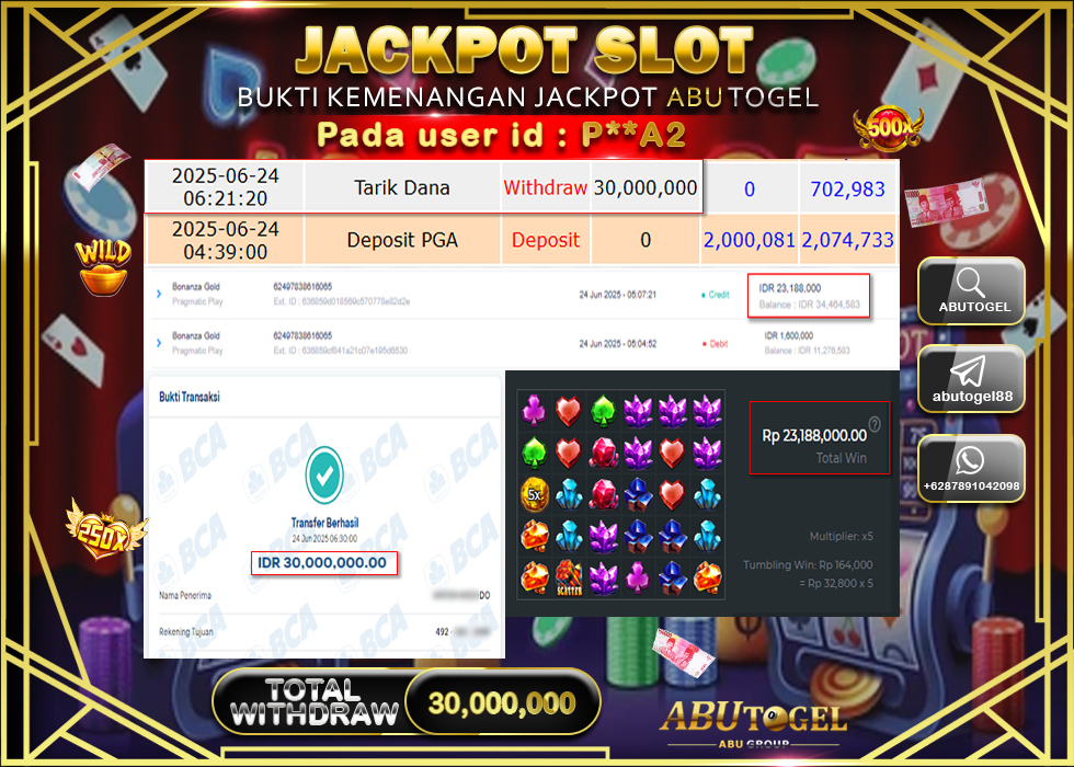 Berikut adalah Bukti Jackpot ABUTOGEL Slot Online Selasa, 24 Juni 2025 :