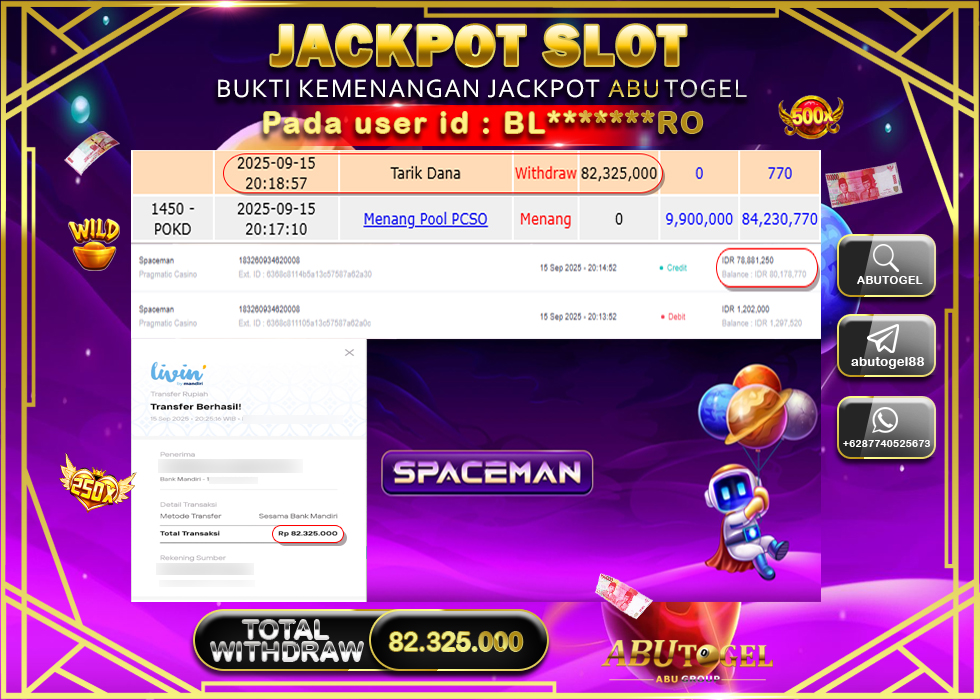 Berikut adalah Bukti Jackpot ABUTOGEL Slot Online Senin 15 September 2025 :