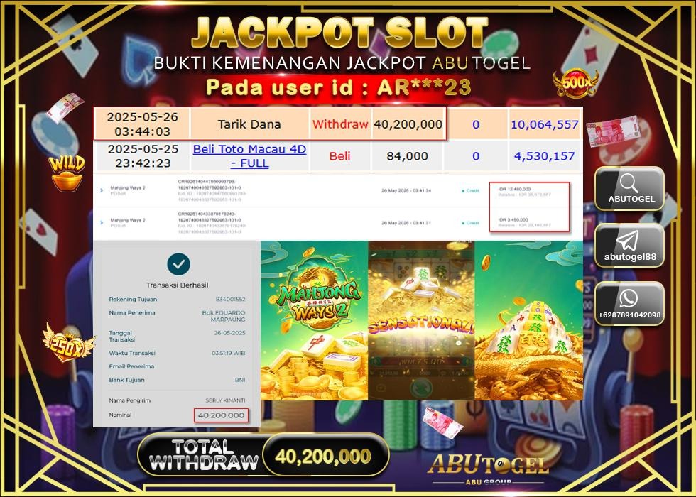 Berikut adalah Bukti Jackpot ABUTOGEL Slot Online Senin, 26 Mei 2025 :