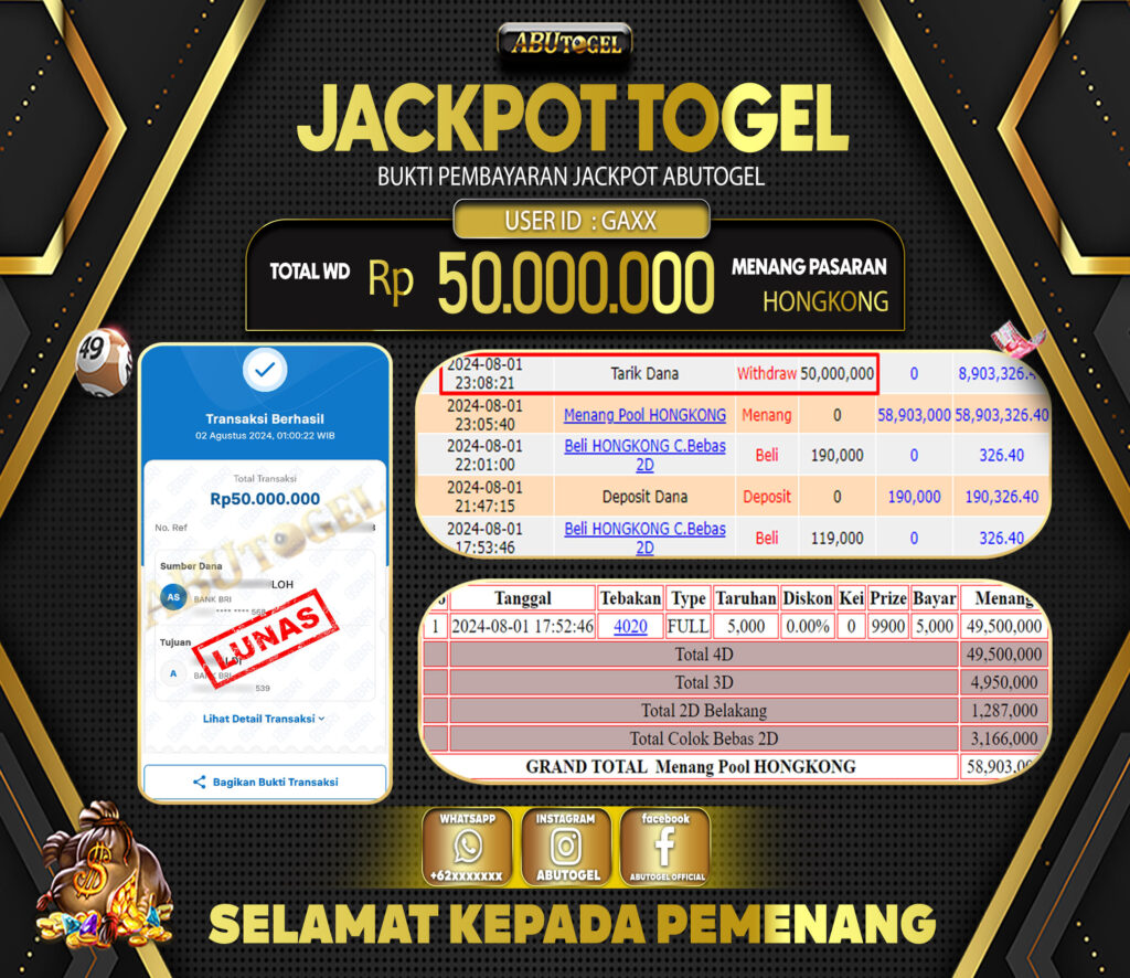 Berikut adalah Bukti Jackpot Togel Online ABUTOGEL Kamis, 01 Agustus 2024 :