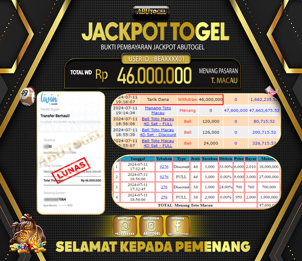 Bukti Jackpot Togel Online ABUTOGEL Kamis 11 Juli 2024 – ABUTOGEL adalah bo togel onlinne terpercaya. Berikut ini kami berikan info buktu jackpot member ABUTOGEL yang sudah kami bayar lunas dalam permainan togel online.