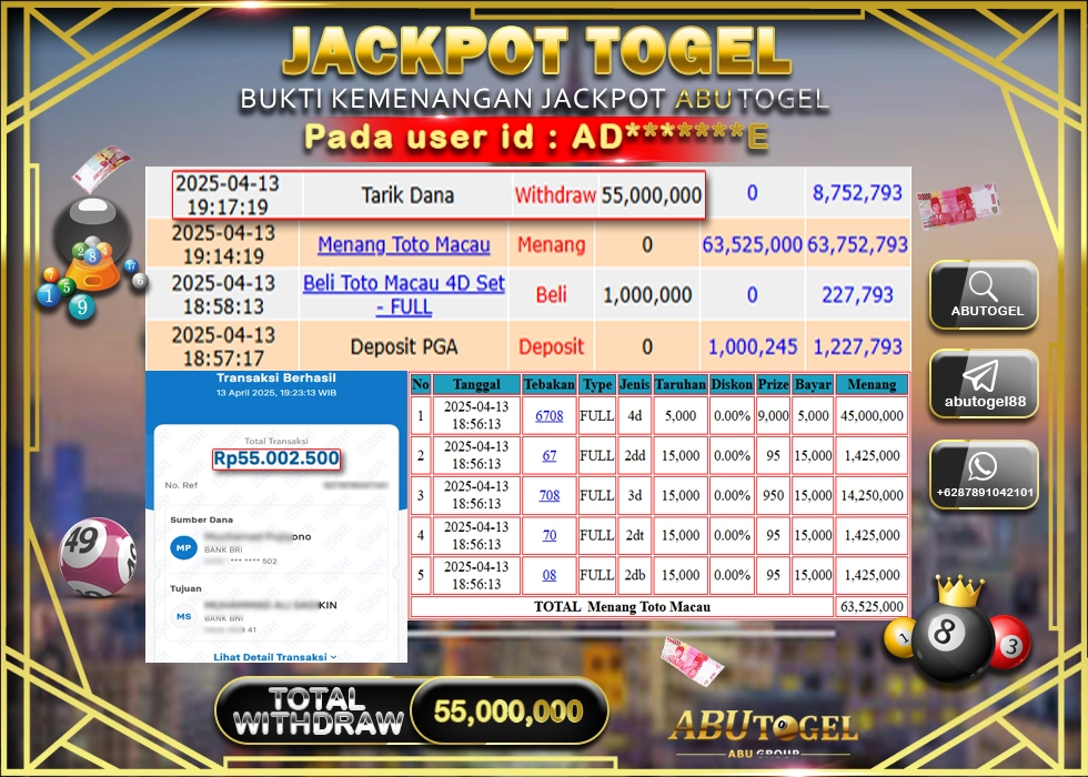 Berikut adalah Bukti Jackpot Togel Online ABUTOGEL Minggu, 13 April 2025 :
