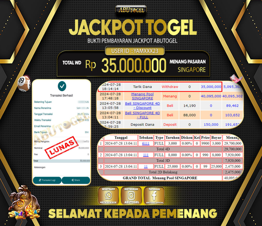 3 min readBukti Jackpot Togel Online ABUTOGEL Minggu 28 Juli 2024 – ABUTOGEL adalah bo togel onlinne terpercaya. Berikut ini kami berikan info buktu jackpot member ABUTOGEL yang sudah kami bayar lunas dalam permainan togel online.