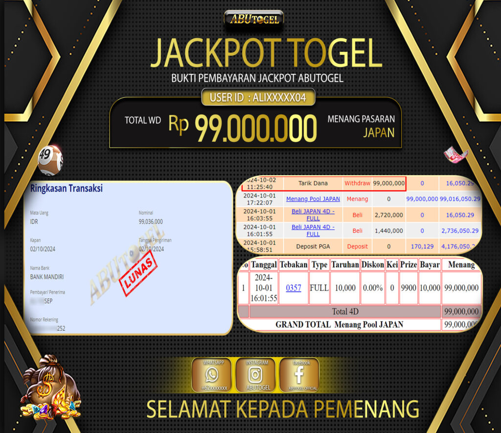 Bukti Jackpot Togel Online ABUTOGEL Rabu 02 Oktober 2024 – ABUTOGEL adalah bo togel onlinne terpercaya. Berikut ini kami berikan info buktu jackpot member ABUTOGEL yang sudah kami bayar lunas dalam permainan togel online.
