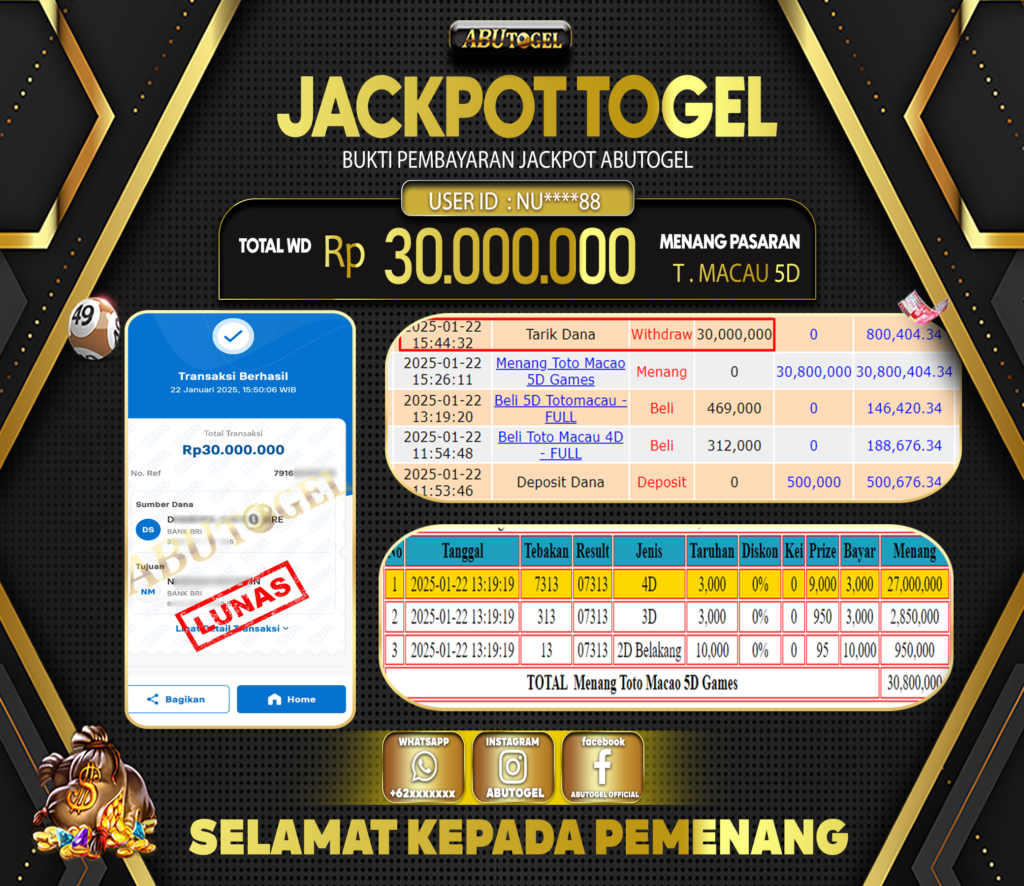 Berikut adalah Bukti Jackpot Togel Online ABUTOGEL Rabu, 22 Januari 2025 :