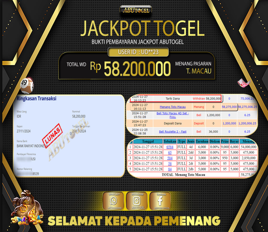 Berikut adalah Bukti Jackpot Togel Online ABUTOGEL Rabu, 27 November 2024 :