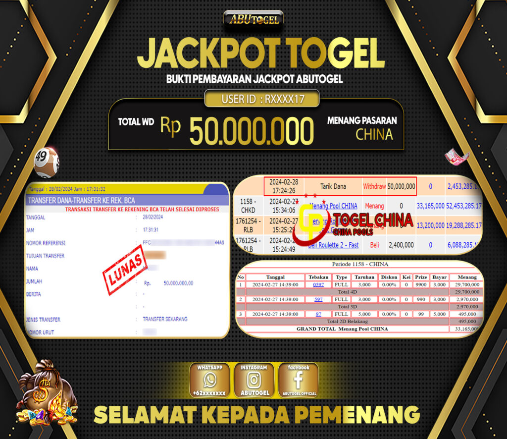 Berikut adalah Bukti Jackpot Togel Online ABUTOGEL Rabu, 28 Februari 2024 :