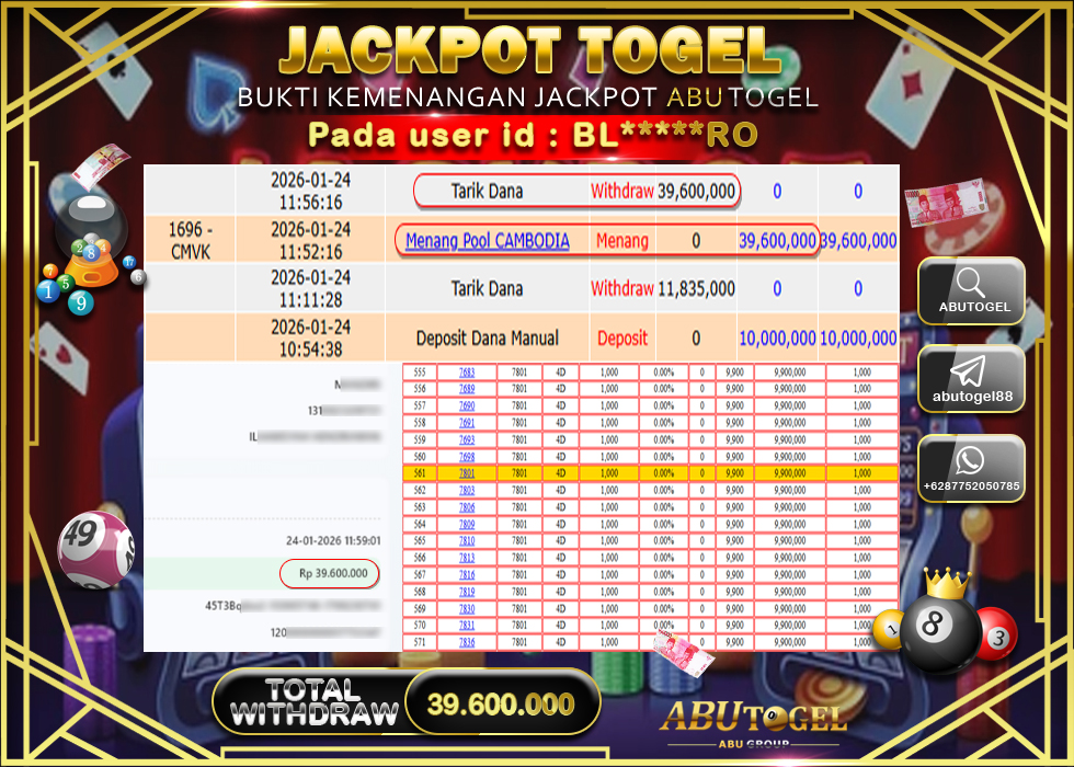 Berikut adalah Bukti Jackpot Togel Online ABUTOGEL Sabtu 24 January 2026 :
