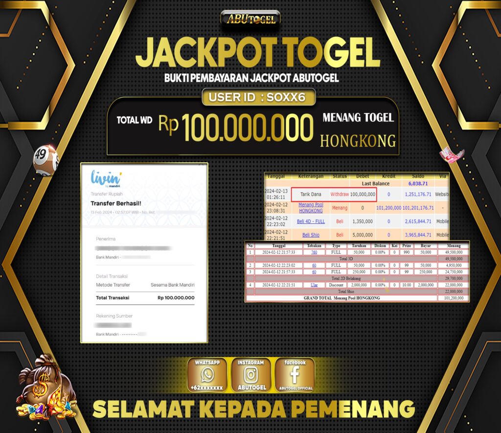 3 min readBukti Jackpot Togel Online ABUTOGEL Selasa 13 Februari 2024 – ABUTOGEL adalah bo togel onlinne terpercaya. Berikut ini kami berikan info buktu jackpot member ABUTOGEL yang sudah kami bayar lunas dalam permainan togel online.