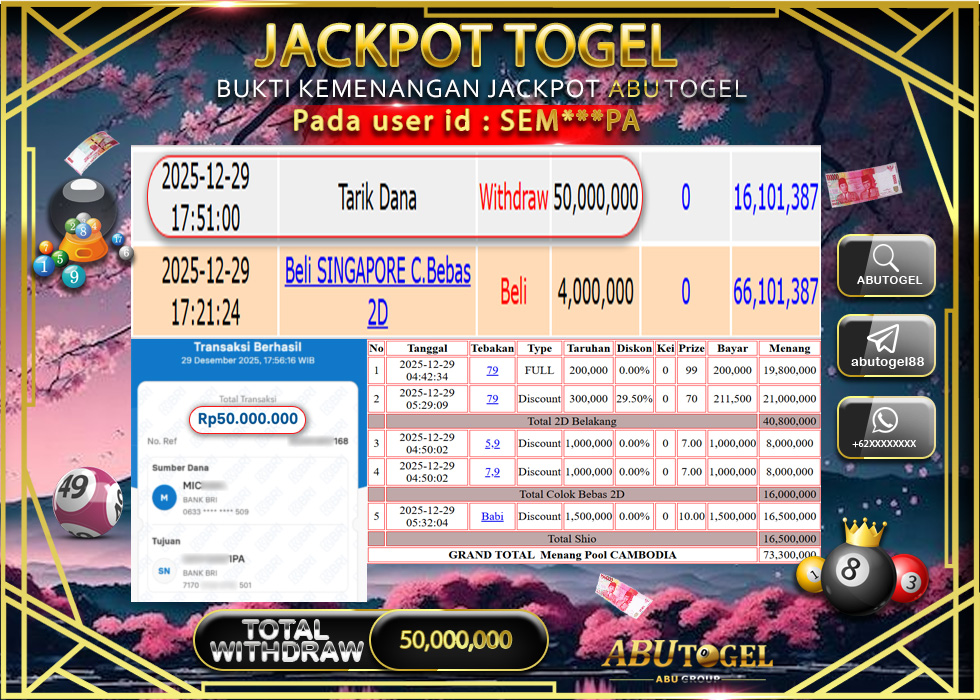 Berikut adalah Bukti Jackpot Togel Online ABUTOGEL Selasa 30 Desember 2025 :