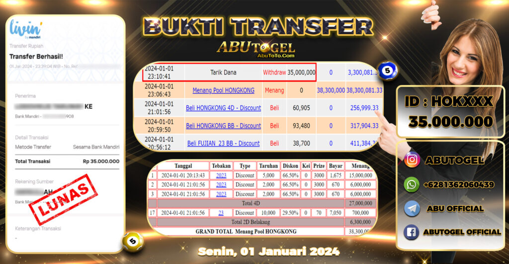 Bukti transfer yang kami publis adalah bukti kemengan player di atas 30 juta dan sudah kami bayar lunas tanpa di cicil. Untuk bukti pembayaran lainnya kalian dapat langsung melihatnya di group facebook resmi ABUTOGEL.