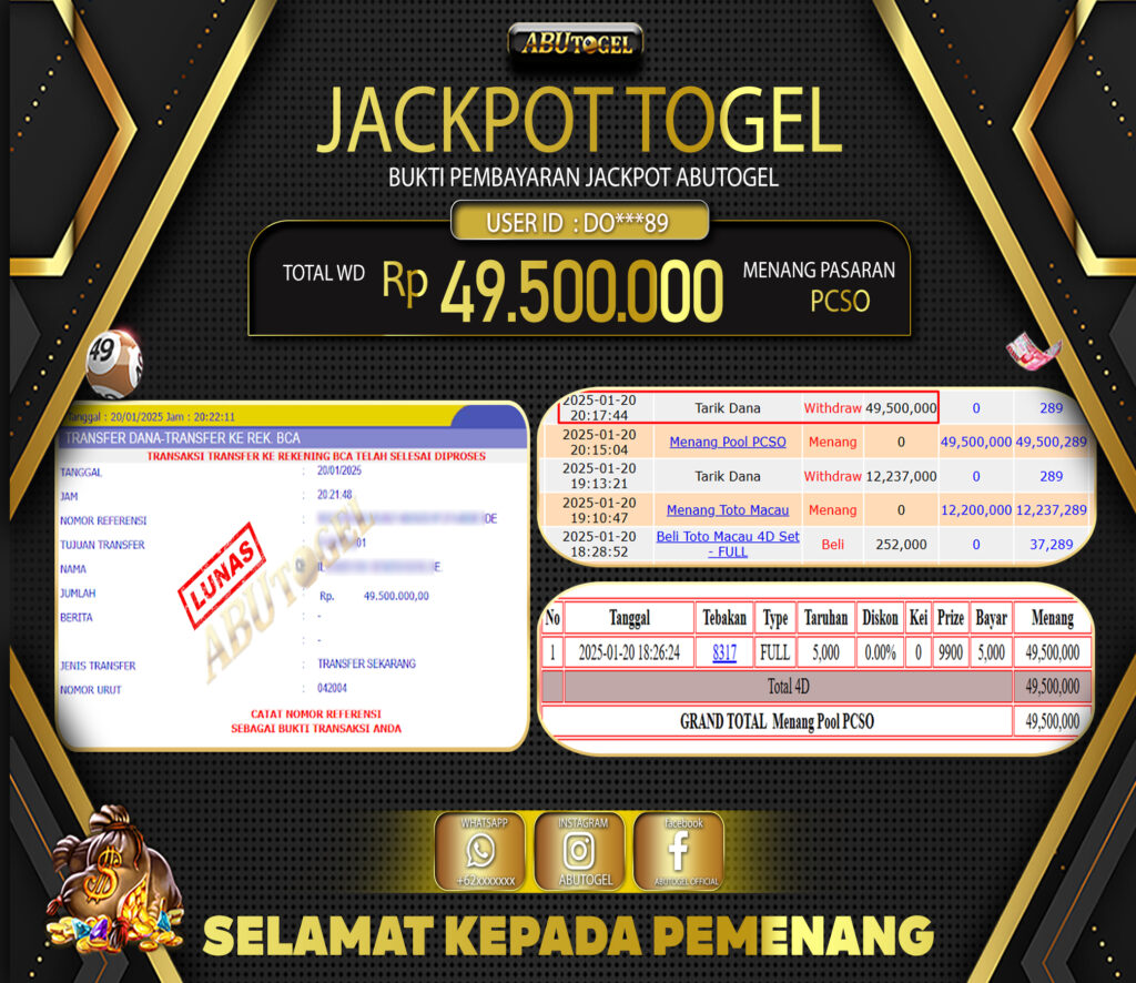 Bukti Jackpot Togel Online ABUTOGEL Senin 20 Januari 2025 – ABUTOGEL adalah bo togel onlinne terpercaya. Berikut ini kami berikan info buktu jackpot member ABUTOGEL yang sudah kami bayar lunas dalam permainan togel online.
