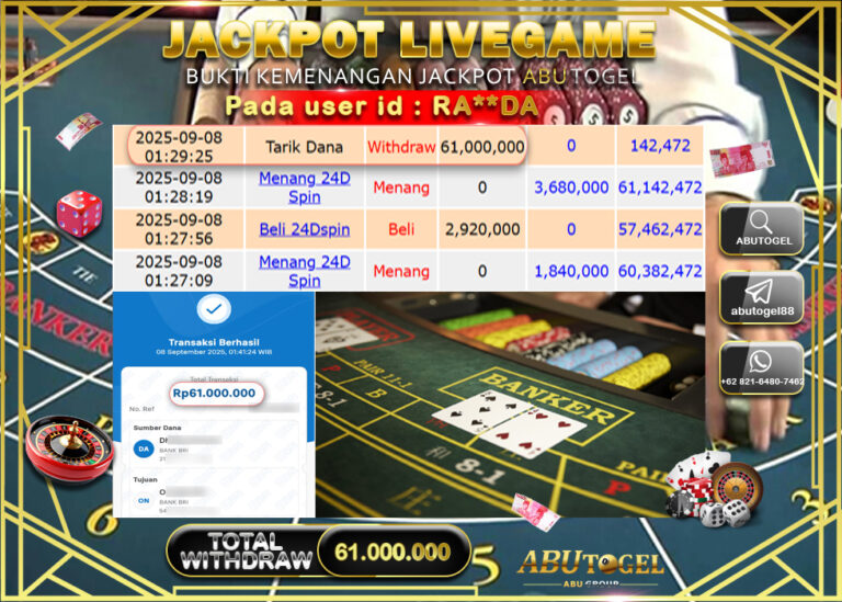 Bukti Jackpot ABUTOGEL Live Casino Kamis 25 September 2025 - ABUTOGEL adalah situs live casino terpercaya. Berikut ini kami berikan...