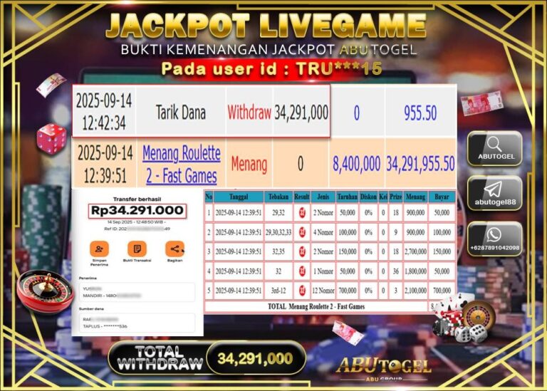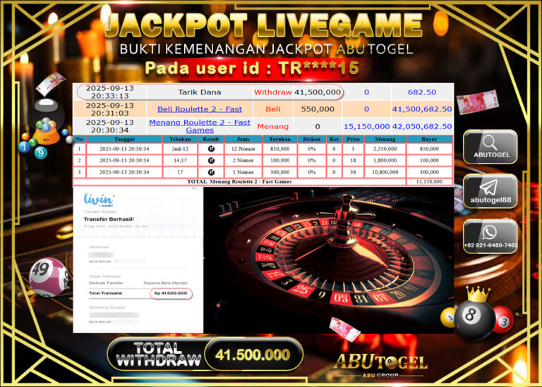 Bukti Jackpot ABUTOGEL Live Casino Sabtu 13 September 2025 - ABUTOGEL adalah situs live casino terpercaya. Berikut ini kami berikan info...