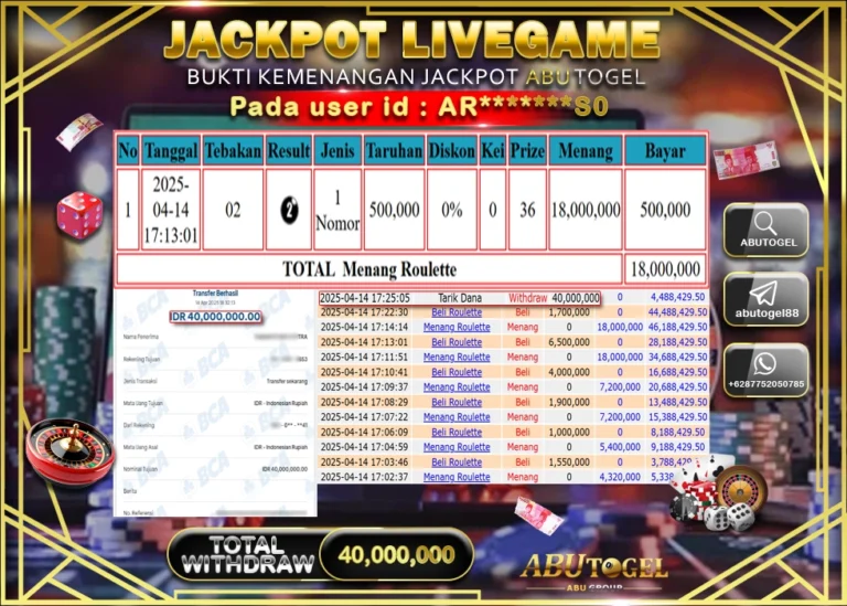 Bukti Jackpot ABUTOGEL Live Casino Senin 14 April 2025 - ABUTOGEL adalah situs live casino terpercaya. Berikut ini kami berikan info...