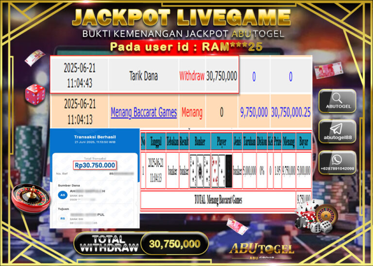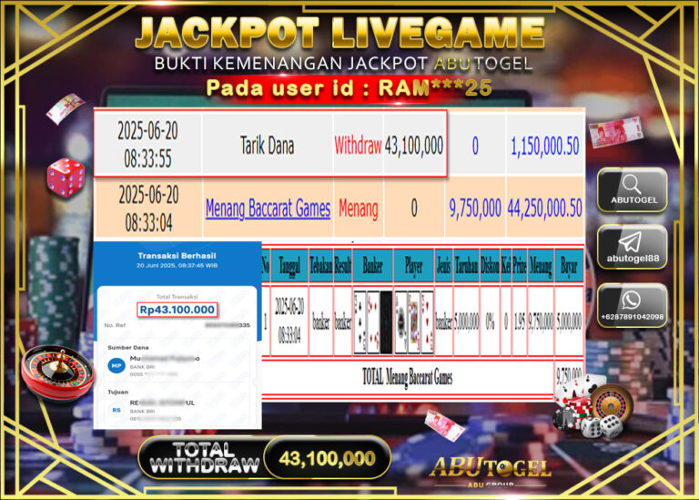 Bukti Jackpot ABUTOGEL Live Casino Sabtu 21 Juni 2025 - ABUTOGEL adalah situs live casino terpercaya. Berikut ini kami berikan...