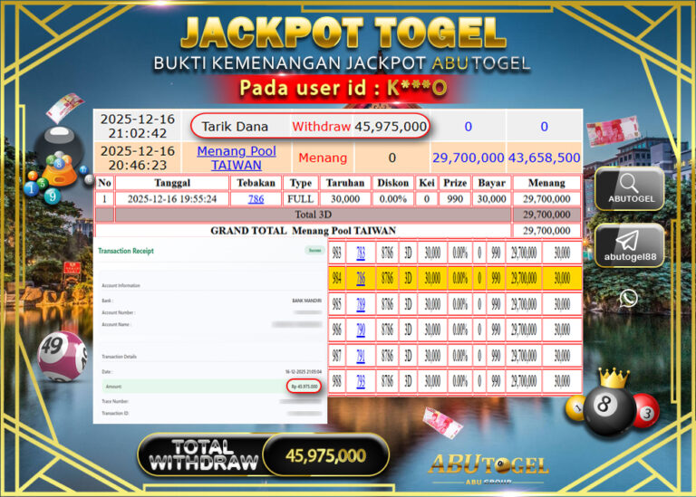 Bukti Jackpot Togel Online ABUTOGEL Selasa 16 Desember 2025 - ABUTOGEL adalah bo togel onlinne terpercaya. Berikut ini kami berikan...