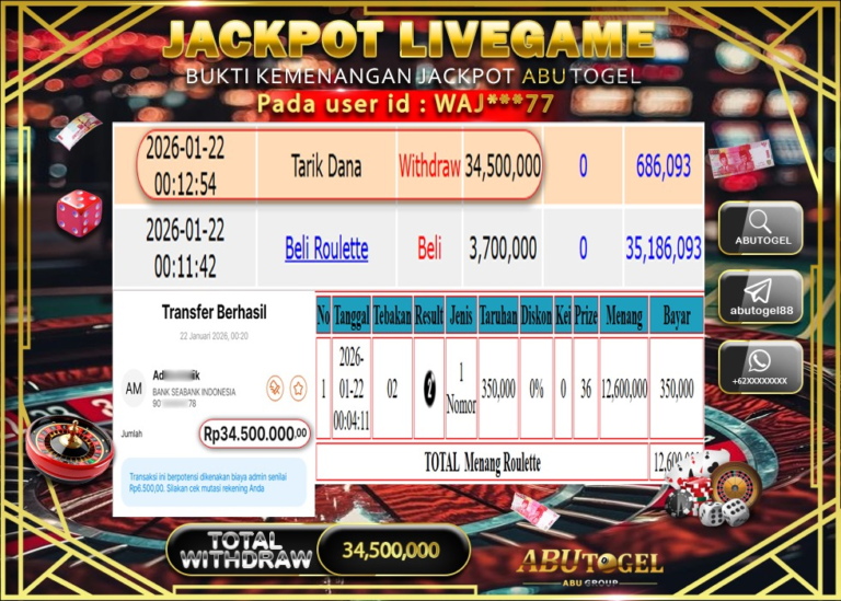 Bukti Jackpot ABUTOGEL Live Casino Kamis 22 January 2026 - ABUTOGEL adalah situs live casino terpercaya. Berikut ini kami berikan...